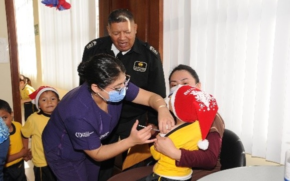 La jornada colaborativa tuvo como objetivo principal la inmunización de niños y niñas de la institución, contribuyendo significativamente a la prevención de enfermedades respiratorias estacionales dentro del entorno escolar, actividad que es parte de las acciones preventivas y del compromiso institucional por el bienestar del personal militar, docente y administrativo. La inmunización se llevó a cabo con el apoyo de personal médico y logística del MSP y del Policlínico de la institución.